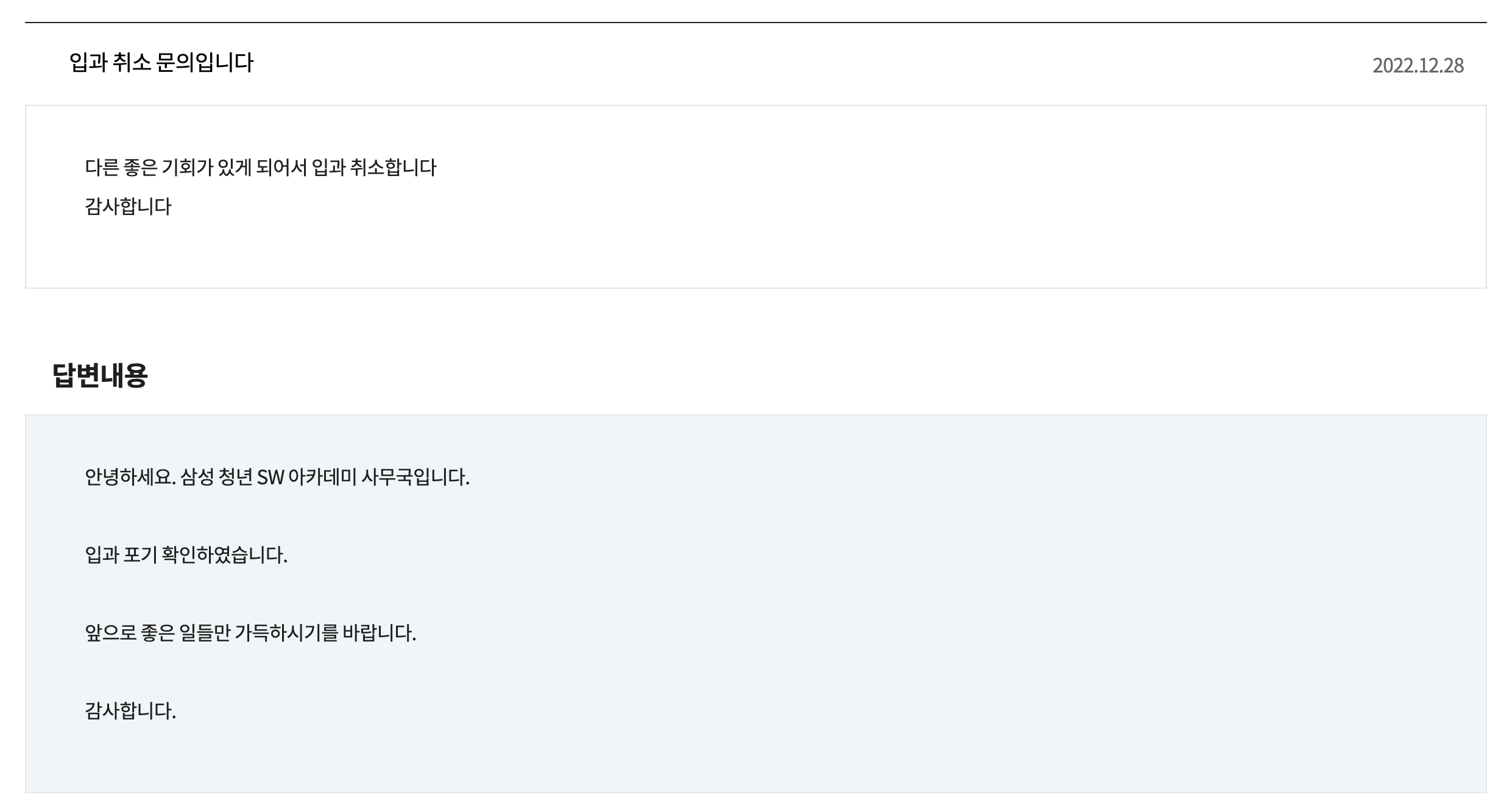 다른 분께 좋은 기회가 주어졌기를 진심으로 바랍니다.