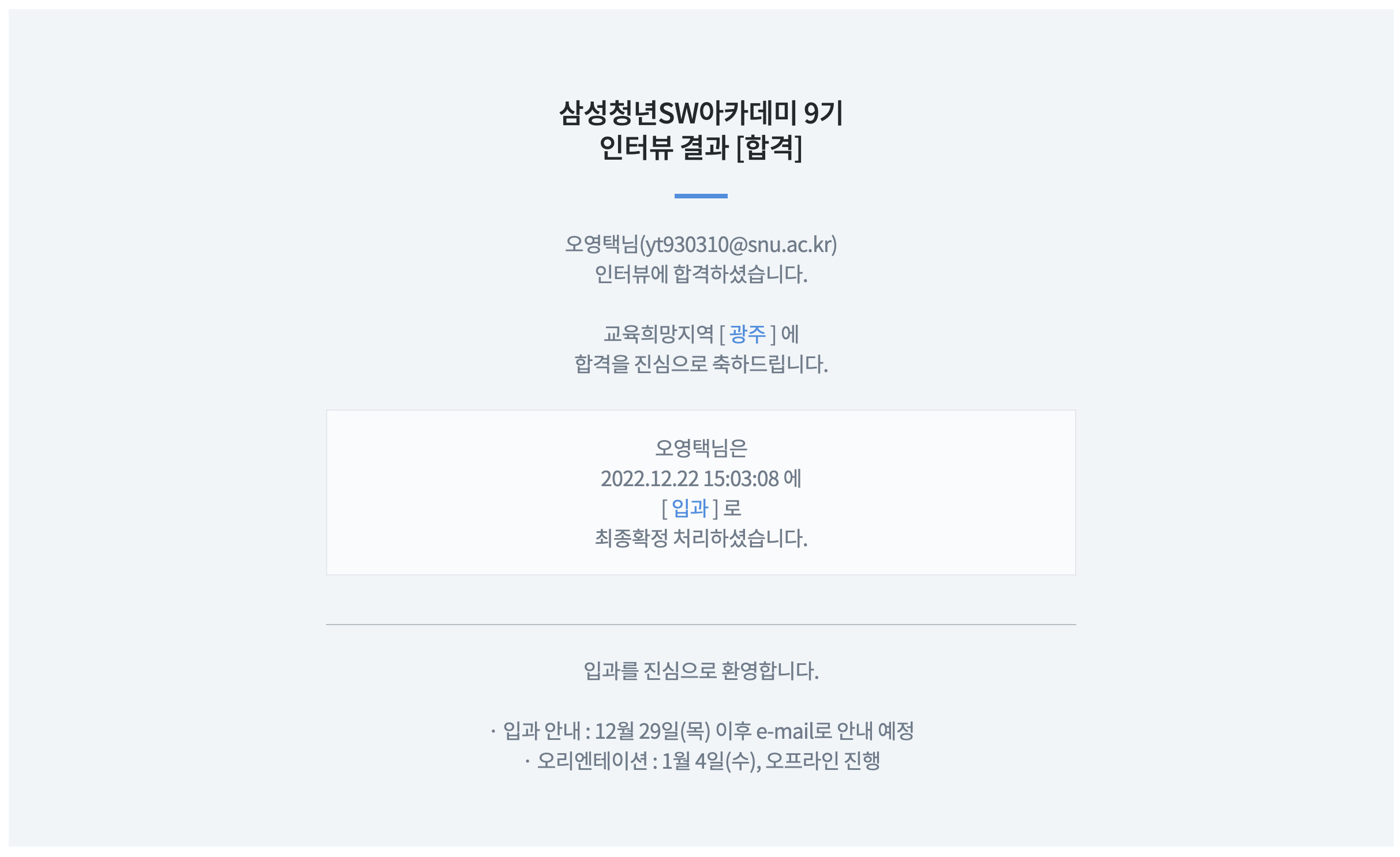 긴 선발 과정 끝에 광주 캠퍼스 최종 합격이라는 좋은 결과를 얻을 수 있었습니다.