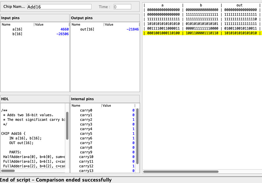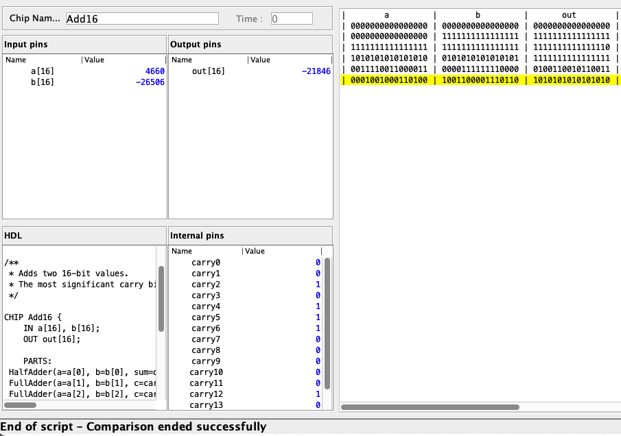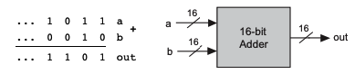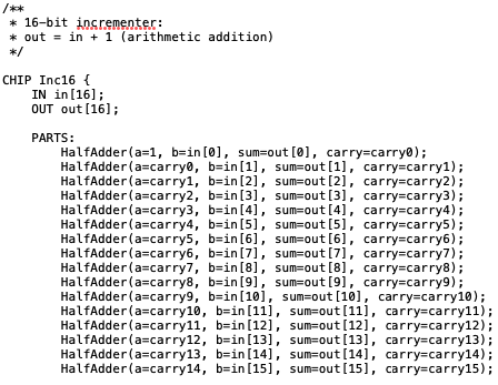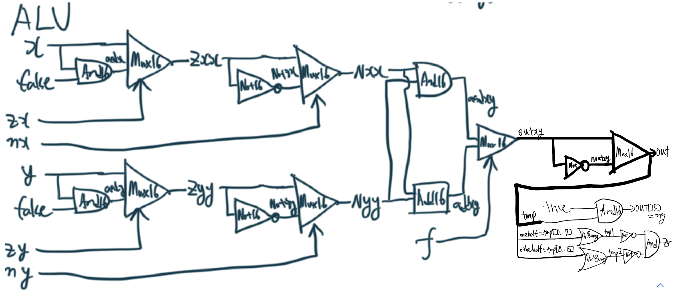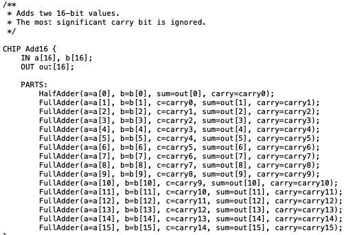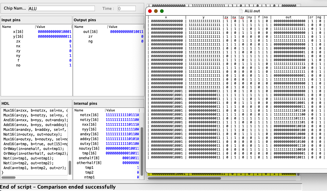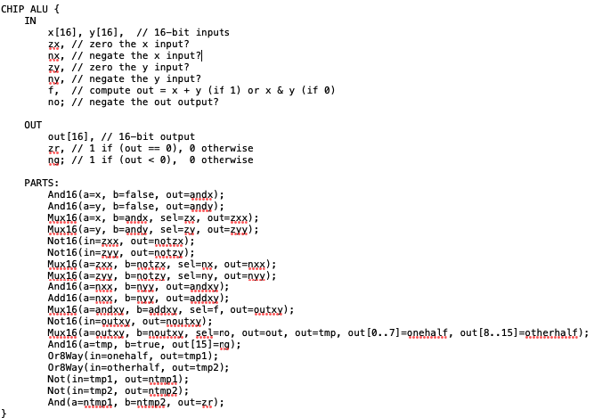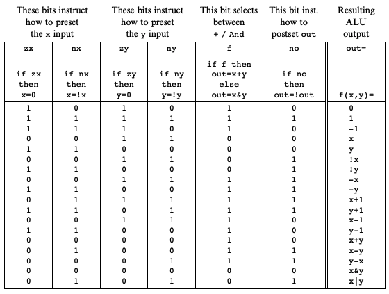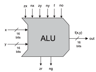 The Hack ALU computes a fixed set of functions out ¼ fiðx; yÞ where x and y are the chip’s two 16-bit inputs, out is the chip’s 16-bit output, and fi is an arithmetic or logical function selected from a fixed repertoire of eighteen possible functions. We instruct the ALU which function to compute by setting six input bits, called control bits, to selected binary values.