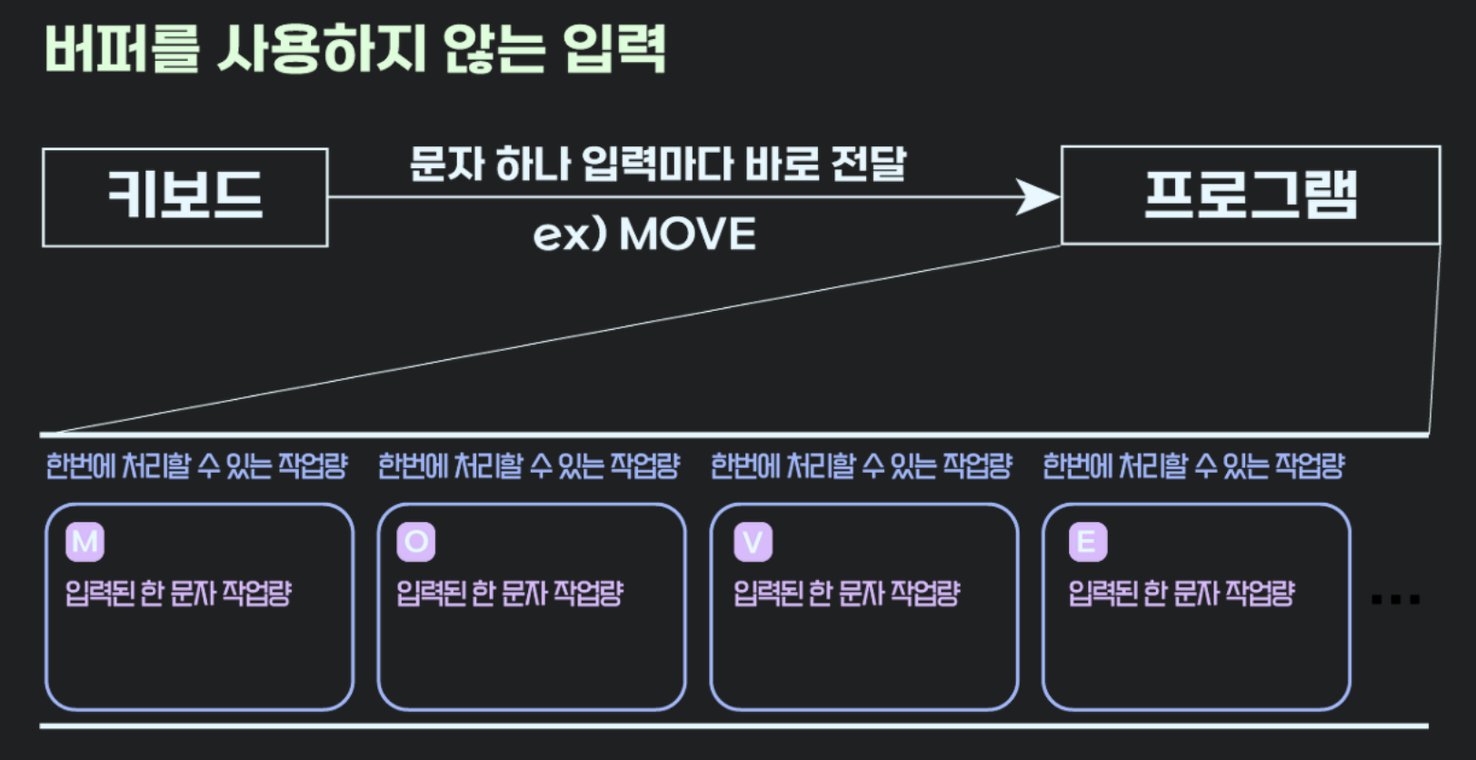 그러므로 한 번에 프로그램에 전달한다면 4번의 전달 과정이 1번으로 줄어들게 되므로, 버퍼를 사용하지 않은 입력을 전달할 때보다 자원적, 시간적 경제성을 확보할 수 있게 되는 것이다.