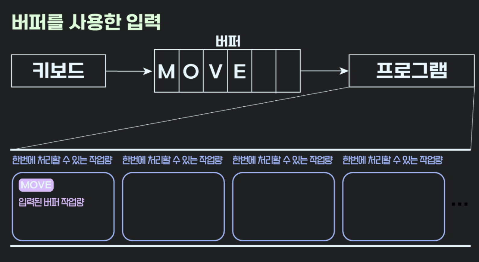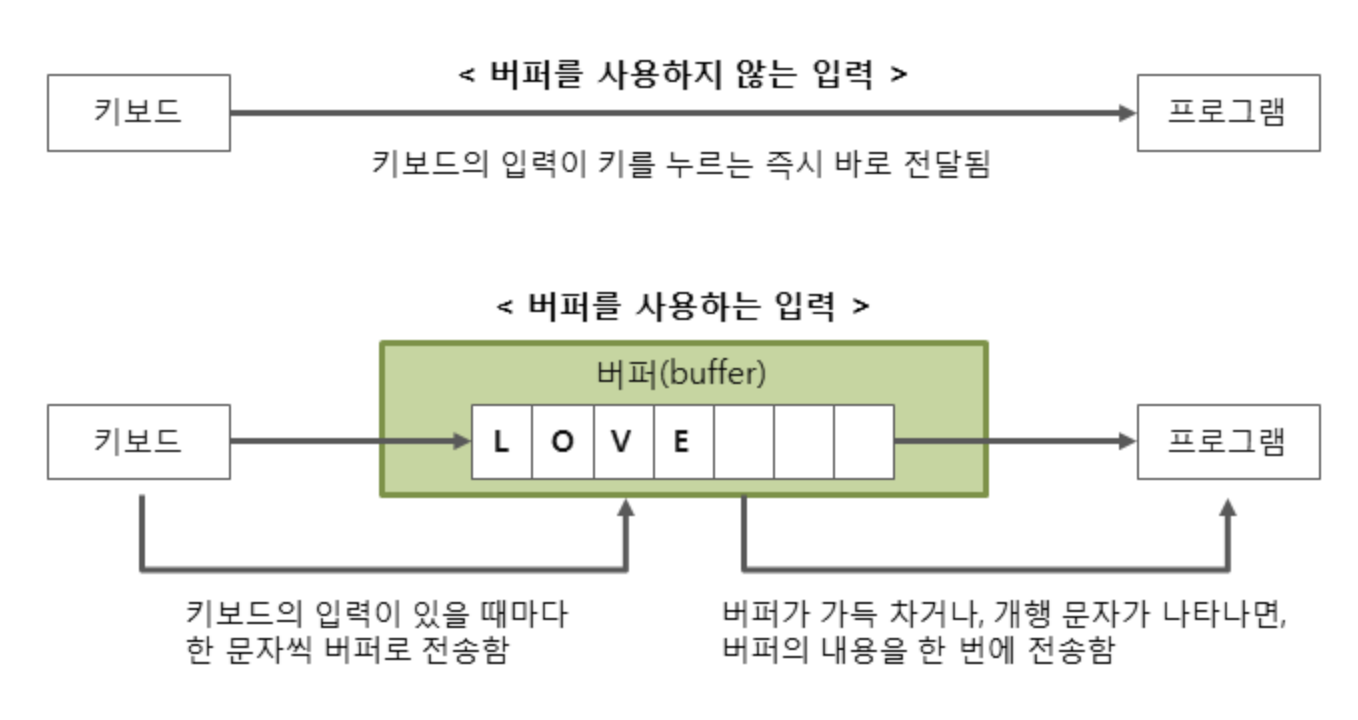 위의 그림에서처럼, 사용자의 입력이나 출력을 바로 처리하지 않고 버퍼에 모았다가 전송함으로써 입력과 출력을 효율적으로 처리한다.