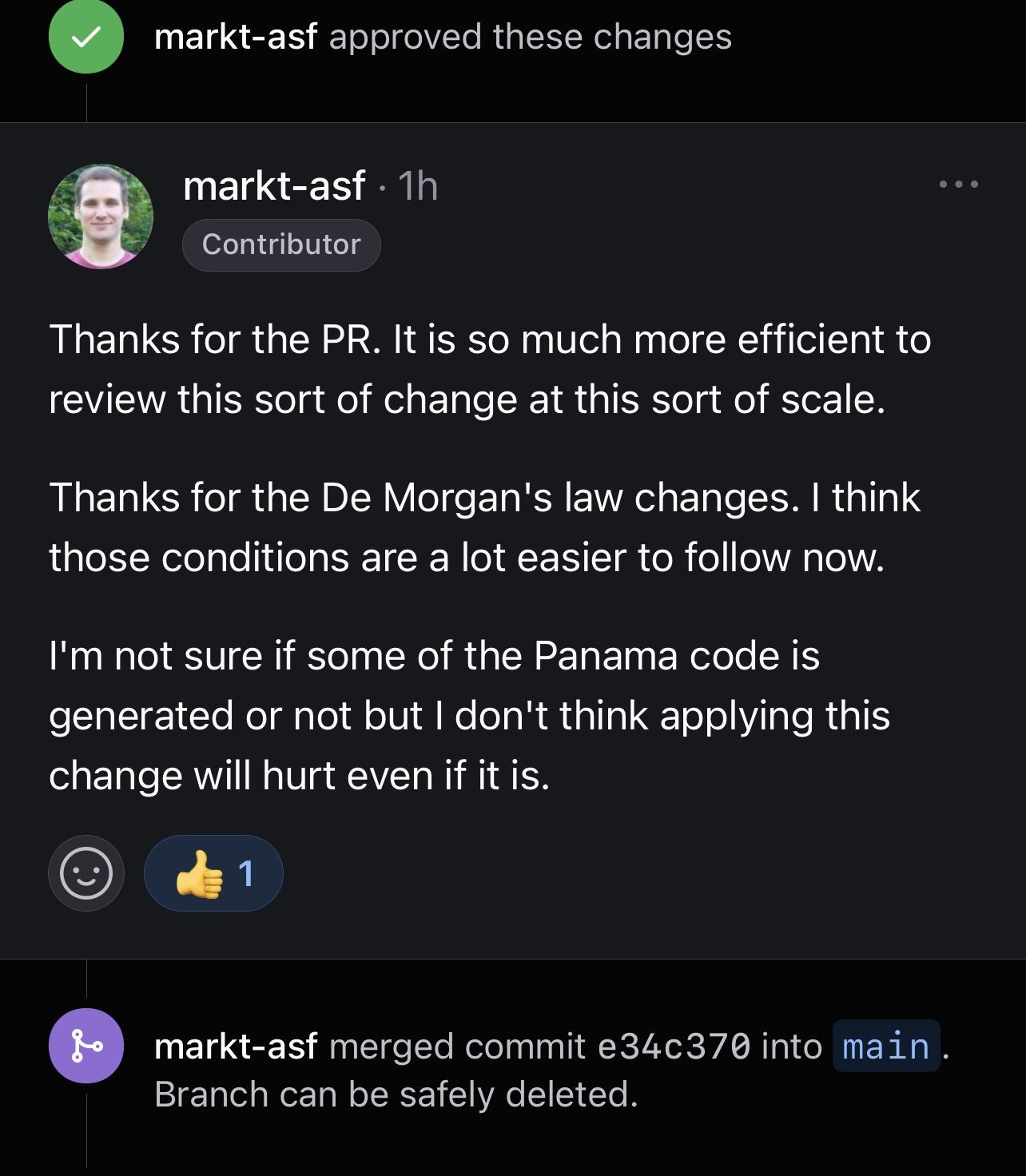 ㅋㅋㅋㅋ 정말 별 거 아닌 수정이지만, 오픈소스에 기여하는 것이 처음이라고 적어놔서 그런지 킹갓엠퍼러제너럴사람좋게생긴 Mark가 무려 'A lot easier to follow'라고... 격려도 해줬다.. 하하!